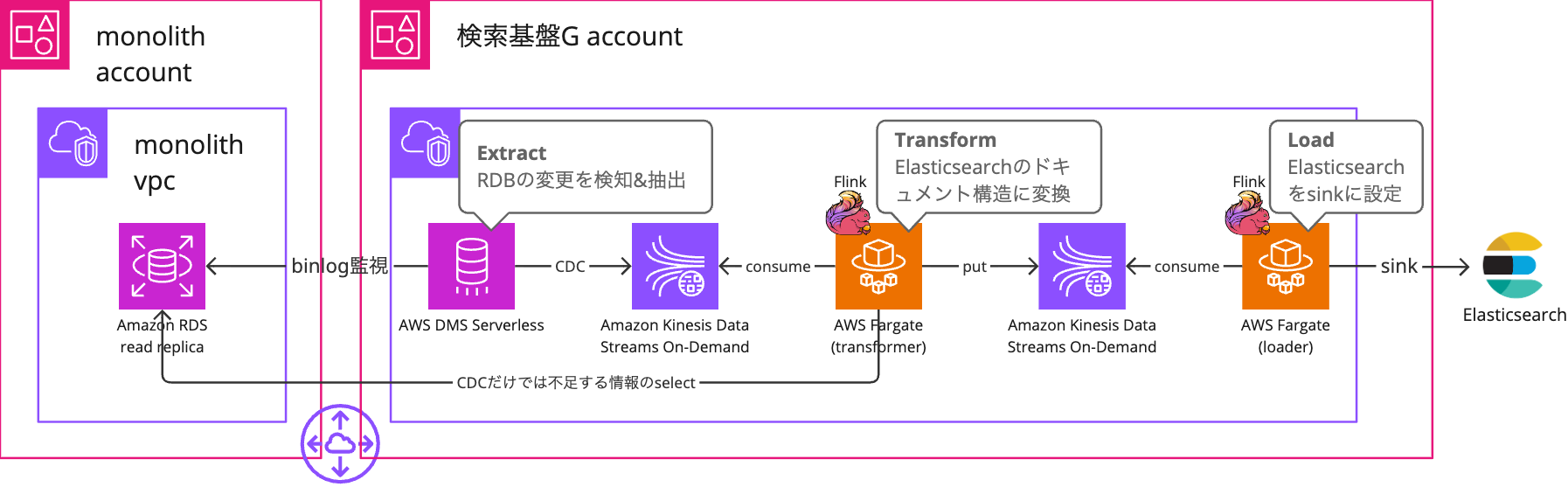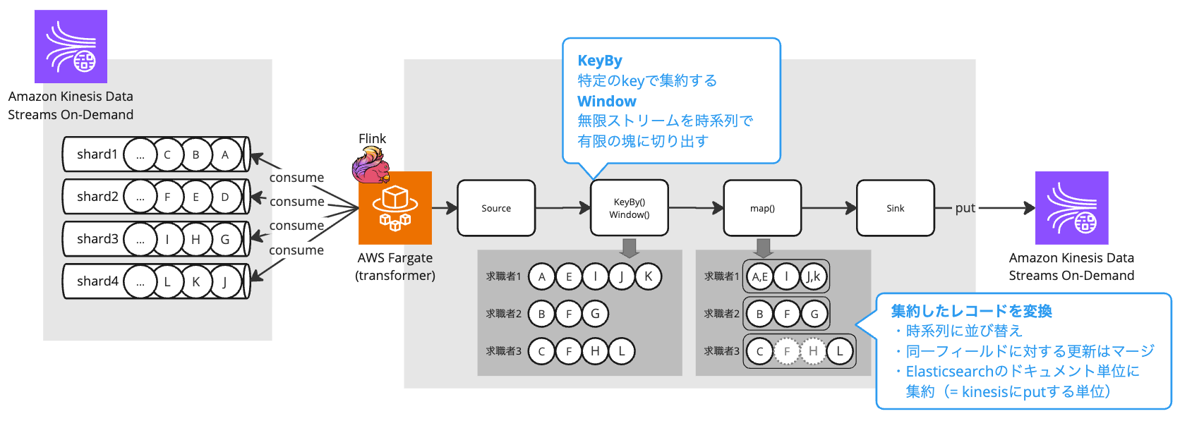 - AWS Fargate上で稼働するApache Flinkアプリケーションがストリームを処理しElasticsearchのドキュメント構造に変換