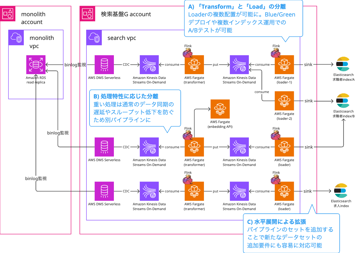 例えば、応答に時間がかかるEmbedding API(ベクトル化)へのアクセス処理を独立したパイプラインに切り出すことで、通常のデータ同期の遅延やスループット低下を防ぐ工夫を取り入れています。