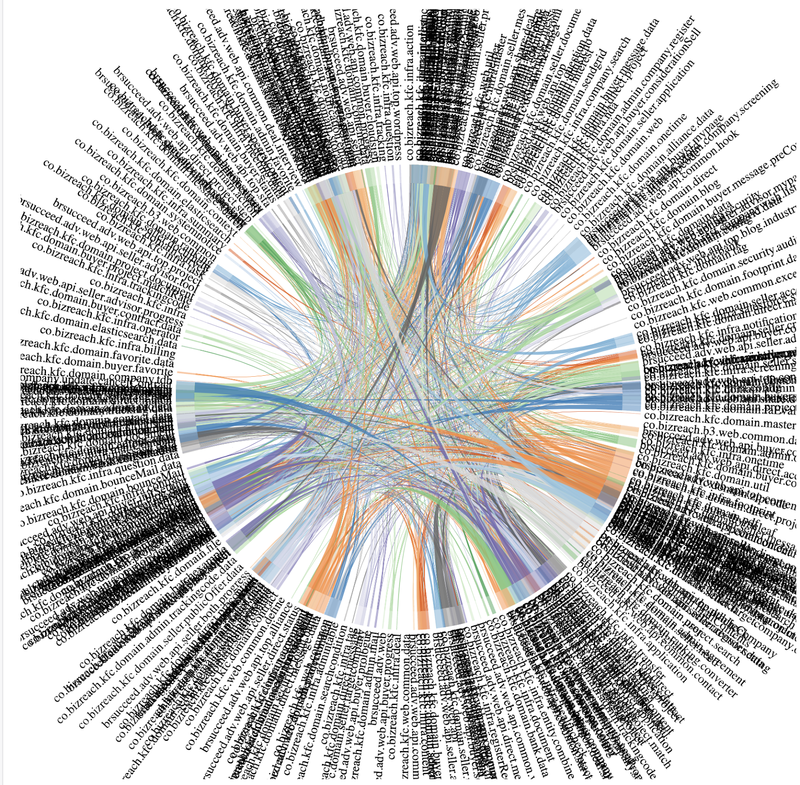 円周上の各要素がパッケージを示しており、それらを結ぶ線がパッケージ間の依存を示している。線が密集しているほど依存関係が複雑で、変更の影響範囲が大きいことを表している。
