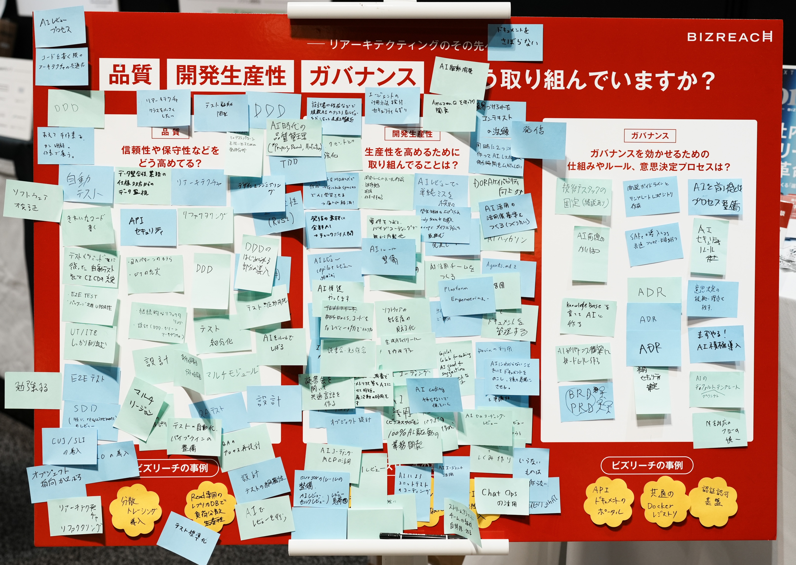 また、ブースではアンケートとして「品質」「開発生産性」「ガバナンス」に対する取り組みについて付箋で回答をボードに残していただき、訪れた方にビズリーチや来場者の方々の取り組みも共有しました。