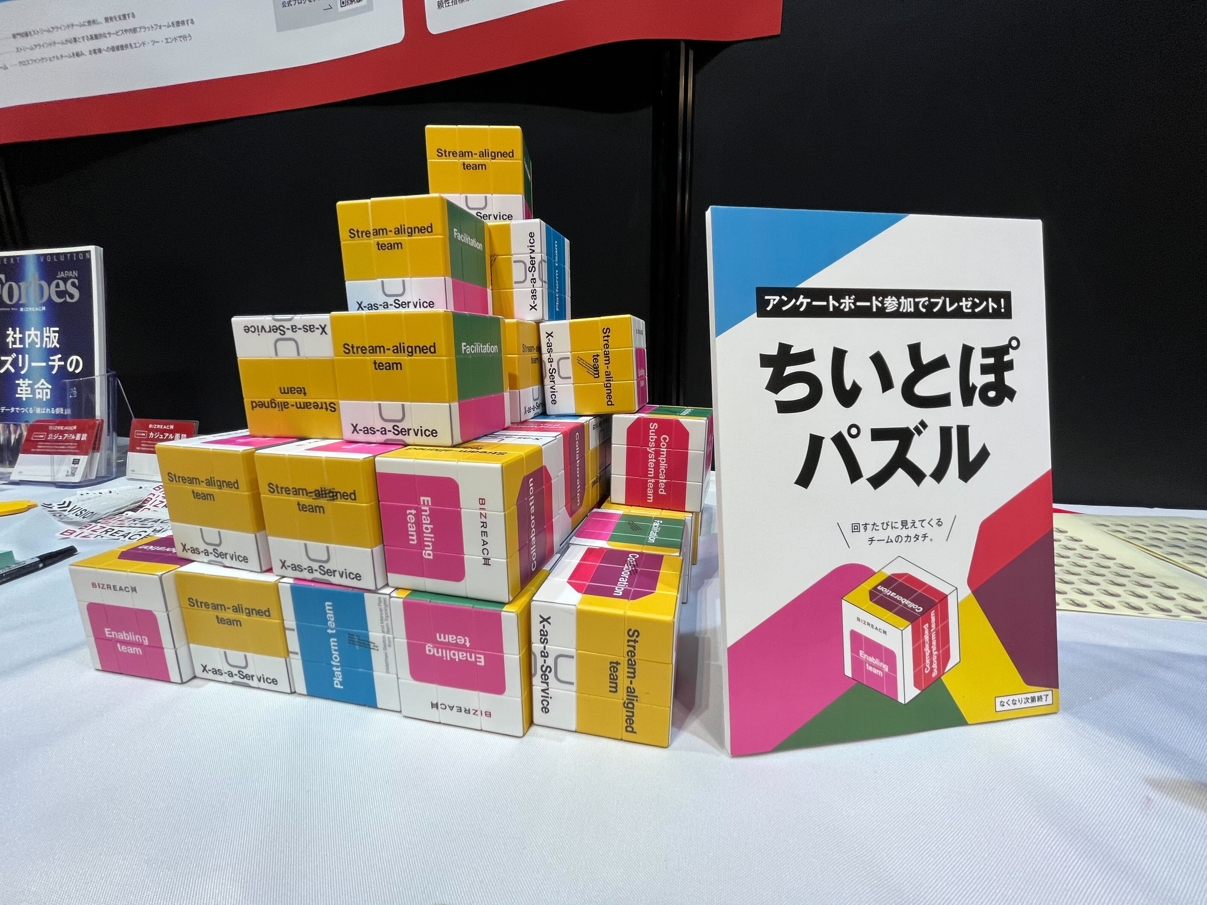 また、ご回答いただいた方にノベルティとして「ちいとぽパズル」(6面パズル)をお渡ししました。ちいとぽパズルはチームトポロジーにおけるチームと相互インタラクションの概念図を揃える形式となっており、ご好評いただきました。