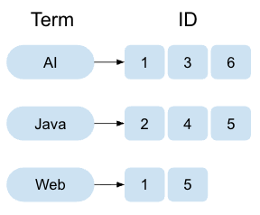 Inverted Index(転置インデックス)は、キーワード検索エンジンで広く用いられるデータ構造です。以下の図のように、各単語(特徴量)に対して、その単語が出現するドキュメントIDのリストを保持します。