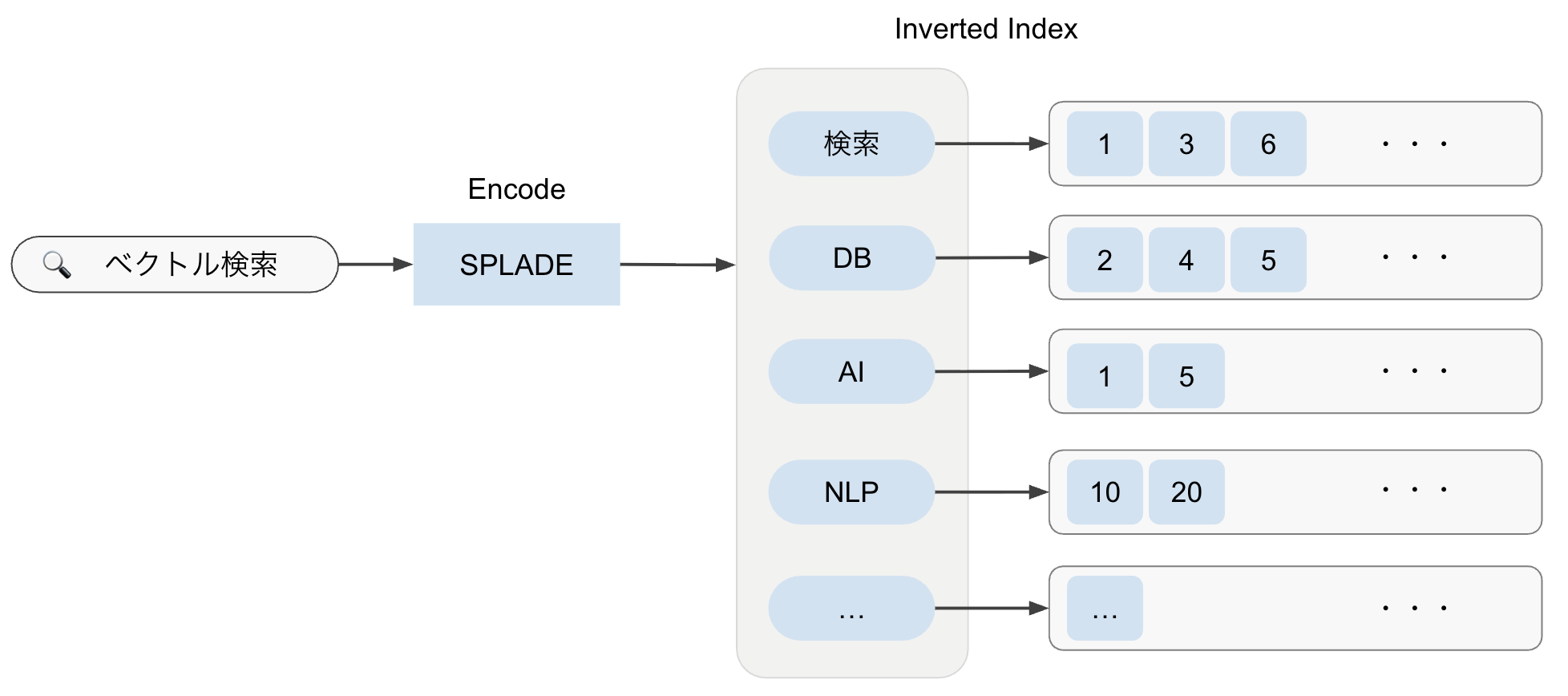 - 検索: クエリに含まれる非ゼロの要素に対応するドキュメントのみをリストから取得し、スコア計算を行います。これにより、全件走査を回避し、高速な検索を実現します。
